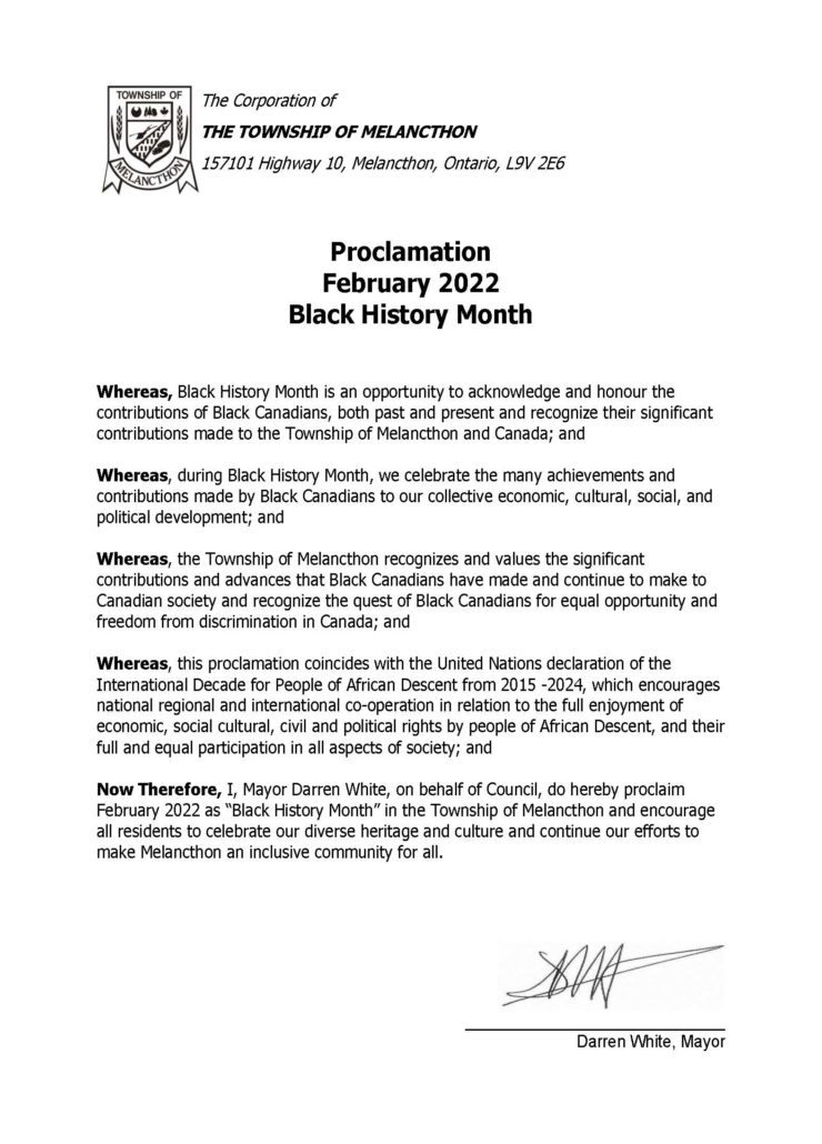 The Township will also be raising the Pan African Flag on Tuesday, February 1, 2022 at 10:00 a.m. with Alethia O’Hara-Stephenson, President & Founder, Dufferin County Canadian Black Association to recognize Black History Month. The Flag will be raised until Tuesday, March 1, 2022.