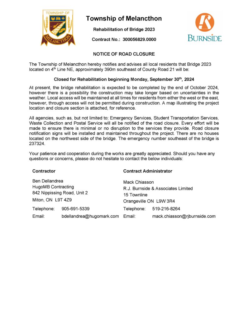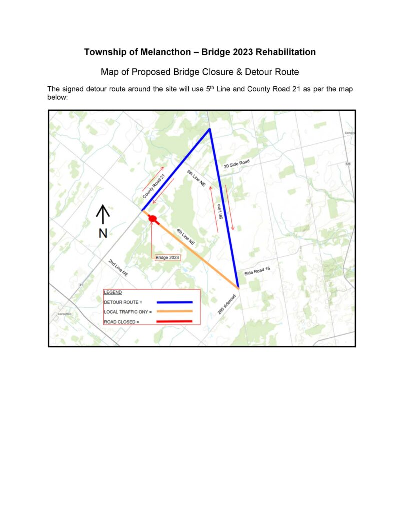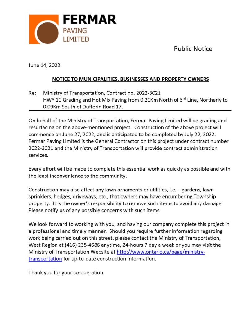 Notice of Construction in Melancthon Township – Provincial Highway 10 – grading and hot mix paving from 0.20 km North of 3rd Line, Northerly to 0.09 km South of Dufferin Road 17 from June 27, 2022 until July 22, 2022.