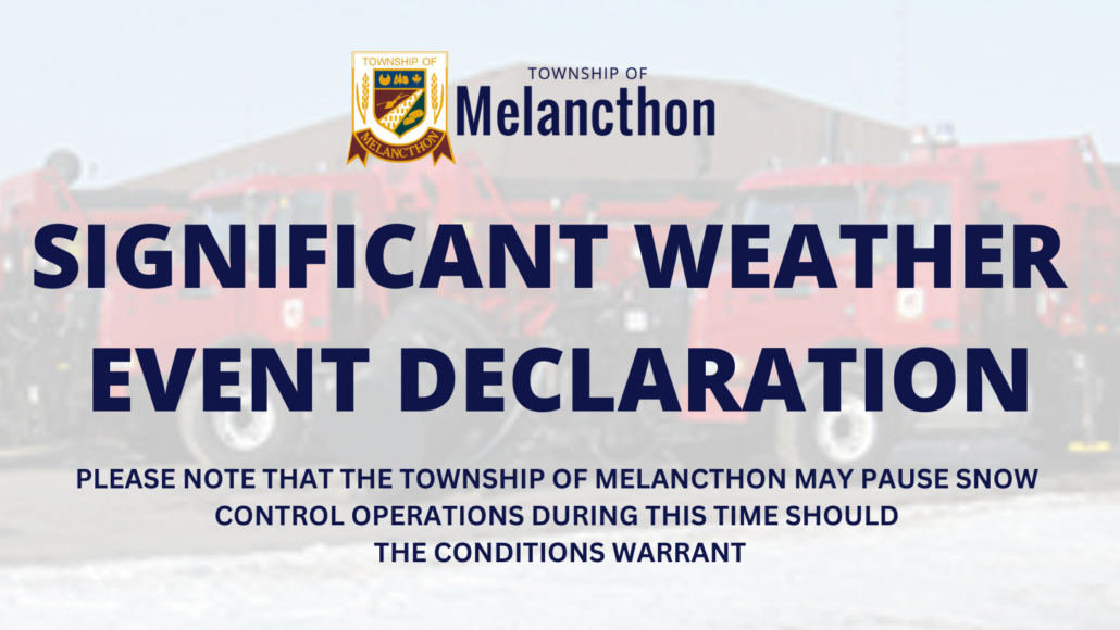 The Township of Melancthon is declaring a Significant Weather Event in respect to blowing snow and reduced visibility, starting at 10:00 a.m. on Saturday, February 19, 2022 and continuing until further notice.