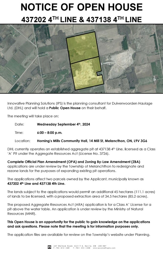 September 8, 2025 – Melancthon, ON – The Township of Melancthon has been notified that the 60-day commenting period under the Aggregate Resources Act (ARA) for the Strada Aggregates Application for a quarry operation within its existing 360-acre sand and gravel pit, will commence on Thursday, September 11, 2025, and will close on Monday, November 10, 2025.