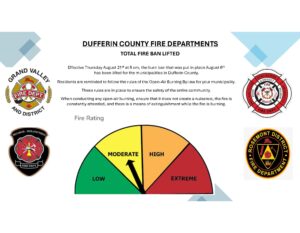 Effective Thursday, August 21st at 8:00 AM, the fire ban issued on August 6th, 2025 has been lifted for all municipalities within Dufferin County.