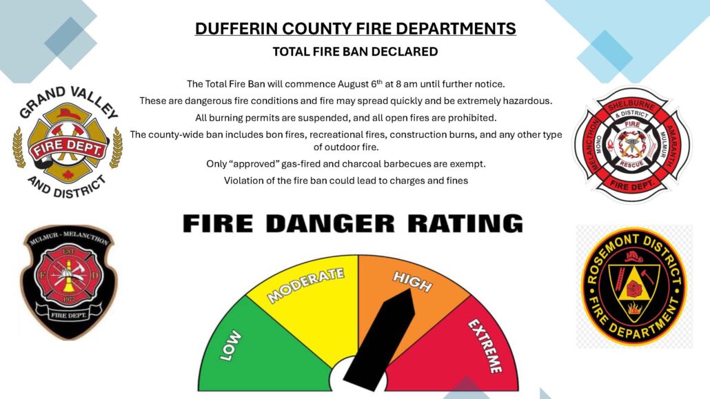 Effective August 6, 2025, at 8:00 a.m., all Fire Departments in Dufferin County have implemented a County-Wide Total Fire Ban.